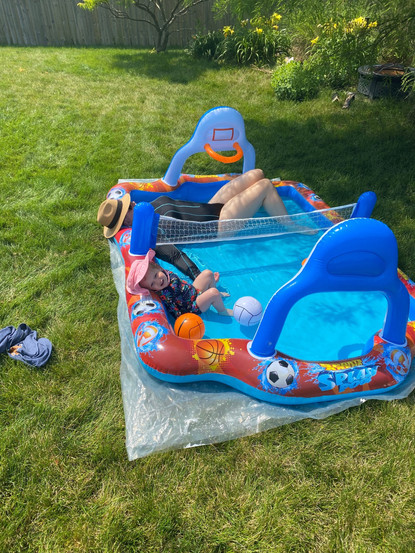 Woke up feeling a bit better (praise the Lord). Decided to make the most of our last day of the holiday weekend, after a weekend full of bed rest, pity parties, tons of Kleenex and snot. So Cory went and scoured the town to find an inflatable pool for us to enjoy with Macy. He ended up coming home with 4 inflatable water toy options - one wicked awesome large inflatable sports themed pool, one regular ol’ kiddie pool, one splash pad and another splash “blob.”
